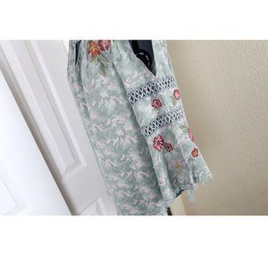 Features buttons down the back, off the shoulder neckline, embroidery, fringe, keyhole neck, & slits on the arms. The perfect Bohemian Blouses.