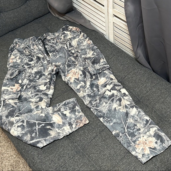 Stylish camo patterned pants with a mix of colors. Perfect for casual wear.