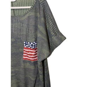 This women's top blends style with patriotism, featuring a camouflage pattern, an American flag pocket, and a stylish front tie detail. Crafted for casual wear, it offers comfort and a unique look for relaxed outings.