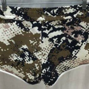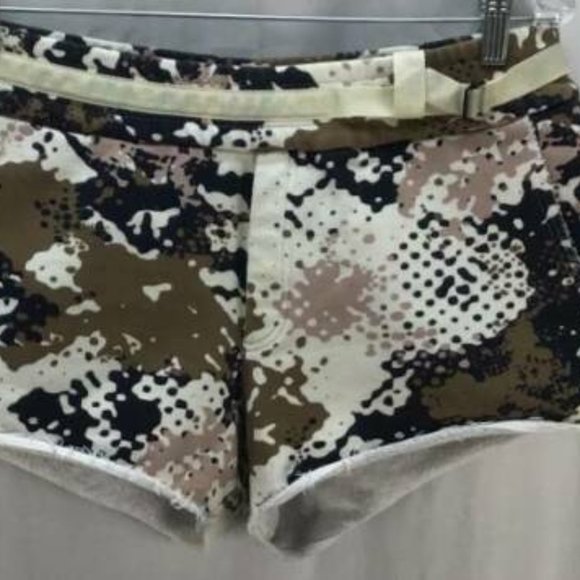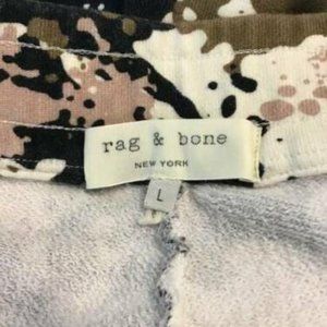 Women's size large shorts from Rag & Bone. The shorts are in green, white and black with a camo pattern. The shorts are pull-on style, mid rise, pockets, unfinished hem and stretch. The shorts are in excellent pre-owned condition.