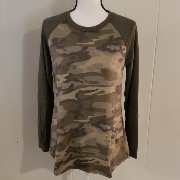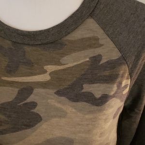 Heather gray and camo raglan with camo elbow patches. I get so many compliments on this piece! The items being sold are new without tags and have never been worn.