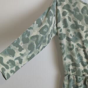 This is an adorable romper in a camo/ animal print ...and doesn't even look like it's been worn!! Very soft , drawstring waist, 3/4 sleeves, key hole button closure on back.