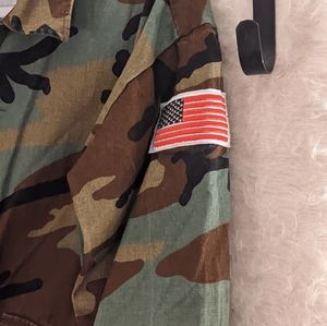 Newest trend, the slightly oversized Shacket, is featured in a camo print. Turn up collar and matching camo buttons down the front hidden by a lapel. Cotton twill fabric, does need to be dry cleaned not machine wash. Longer length, hits mid-hip. Fun piece, perfect for those soon to be arriving spring nights.