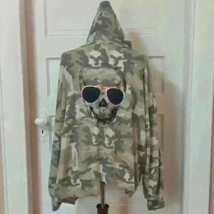 One size fits most. Pull over, assymetrical hem. Oversized fit. Lightweight fleece material. Skull design on back. Great for Spring/Summer. Measures pit to pit 25". This is a Boutique item. I will give a discount at "like". Keep in mind that the item is not negotiable after the discount I give. Thank you!