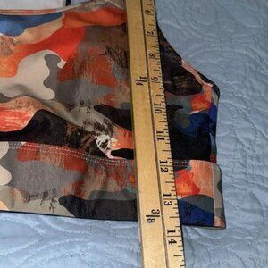 Designed by Lululemon, this multicolor camo sports bra combines style with functionality. It features a racerback design, ensuring comfort and support during workouts. Crafted for active wearers, it offers a blend of vibrant colors and a snug fit, making it ideal for various fitness activities.