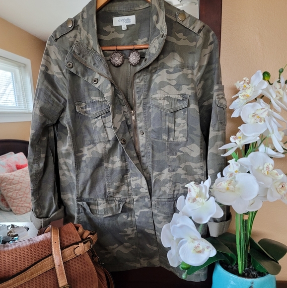 Worn with love. This shirt jacket (shacket) is more fitted. Full zip and button. Two front pockets along hip. Waist length. Has stretch. Looks great open over a tank or tee or zipped as the main entree. Great condition with minimum signs of wear. A great not-so-oversized shacket.