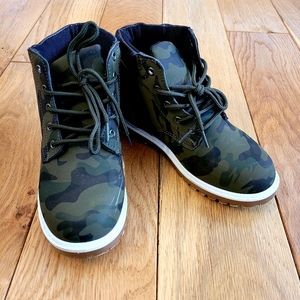 In great condition. There is a scuff on the front of the one boot as noted in photos. With the right shoe polish it could be buffed out. My son wore these 1 time for a costume. Smoke free pet free home.