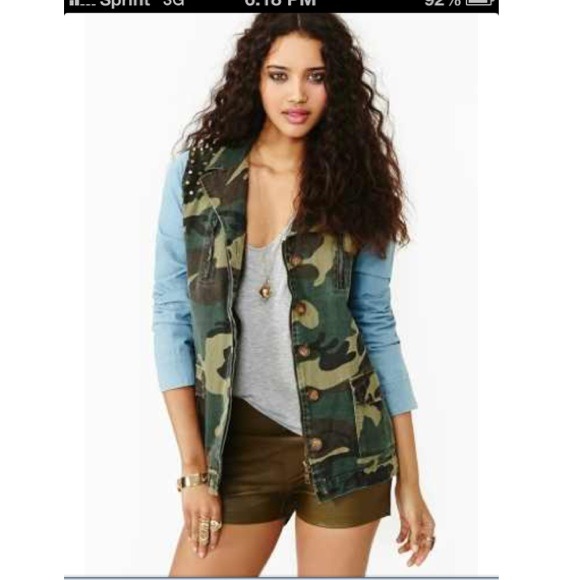Like new! Worn once unique camo jacket with studs and denim sleeves