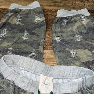 Camo distressed joggers. Grey trim. Elastic waist with string for looks.