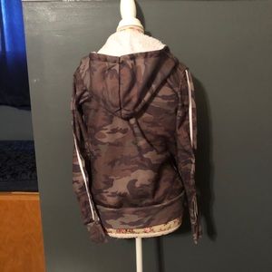 Ladies camo Jacket. This jacket has been worn once! No rips or stains. It has white pin stripes down both arms. It’s really cute on!