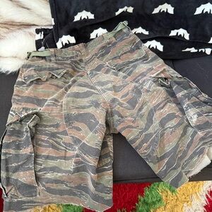 Stay stylish and comfortable with these camouflage cargo shorts. Perfect for casual outings. These were camo pants that I cut into shorts and ended up not liking. Some wear on the pants shown in photos.