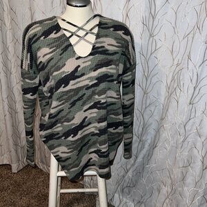 Camo print Waffle long sleeves v-neck with criss cross front.