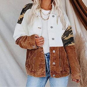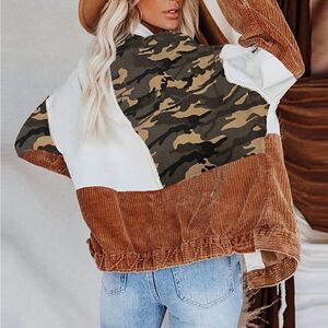 Camo white, brown, and green patchwork jacket. Corduroy design, patchwork detail, relaxed fit, cropped, comfortable, and versatile for every occasion.