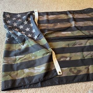 Stylish tapestry featuring an American flag design with camouflage stripes. Perfect for adding a unique touch to any room.