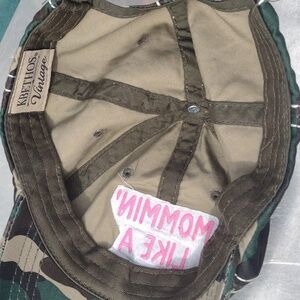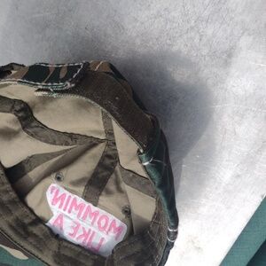 Stylish camouflage cap featuring a pink and white patch with bold text. Perfect for casual outings.