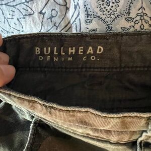 Bullhead men’s skinny cargo pants in olive green. Features a slim, tapered fit with classic cargo pockets on the sides and back, zip fly with button closure, and belt loops. Lightweight yet durable cotton blend—perfect for casual streetwear or laid-back weekend looks.