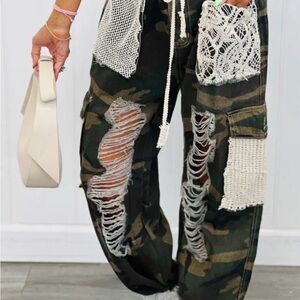 Unique camouflage pants featuring distressed details and crochet accents. Perfect for a bold, edgy look.