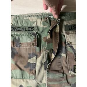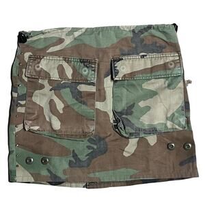 Camouflage Mini Skirt US Navy Seabees Handmade with real fatigues! 28" waist. Green, brown and tan. Made out of fatigues and utility bag. Studded on the sides, hidden buttons on the front, with a snap on top. The sides can be pulled to tighten it. Measures 14.5" across the waist and 15" long. Thank you for looking, we always ship fast!