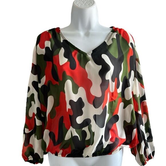 Camouflage Pattern Women Mesh Shirt, Long Sleeve Top, See Through Shirt Size M