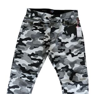 Stylish camouflage stretch skinny jeans. Features a classic camo pattern in shades of black, gray, and white.