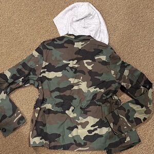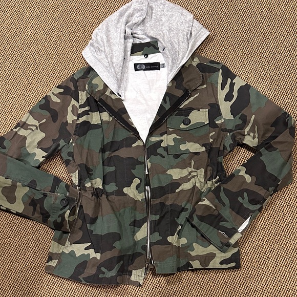 Stay stylish and comfortable with this camouflage utility jacket featuring a cozy gray hood. Perfect for layering and adding a touch of edge to your outfit.