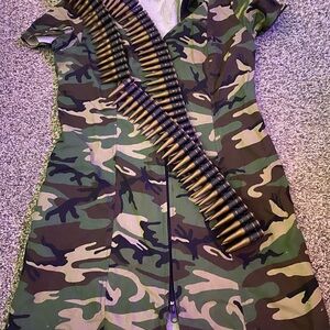 Stylish camouflage dress with a front zipper. Comes with fake bullets.
