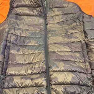 Stylish camouflage puffer vest with a hood. Perfect for layering.