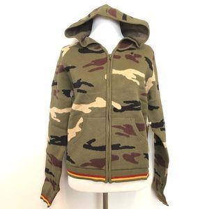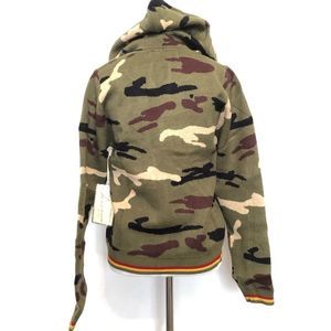camo pattern, 2 front pockets, contrast trim, front zip closure