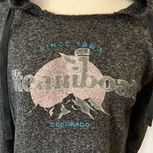 On front..has drawstring at collar, size L..features two pockets in front..great for layering..