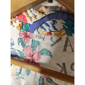 This vintage 1980s button front shirt features a fun graphic scrap book Hawaii all over print. The shirt has attached shoulder pads. Made in USA, it is tagged size Medium. Clean, bright, free of tears, discolorations.