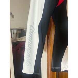 Cycling jacket in very good condition. The red color slightly is bleeding through the white at the collar. See pictures. No other flaws.