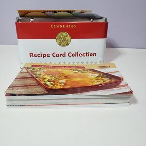 Great pre-owned condition See all pictures for details and measurements. Has index card size recipes and also blank cards. Netal tin closing top container. Very nice