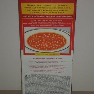 Campbell's Alphabet Soup Barbie doll in her original box. A couple accessories have come loose inside the box -- a mug, bottle, and Goldfish crackers box. The top of the box looks like it has water damage. See pictures.