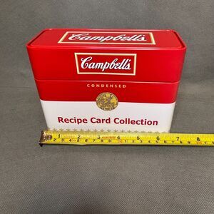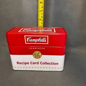 ****** Tin is in excellent condition. Minimal to no signs of wear. Includes Campbell soup recipes on pre-printed recipe cards. Also has blank note cards to add your own recipes.