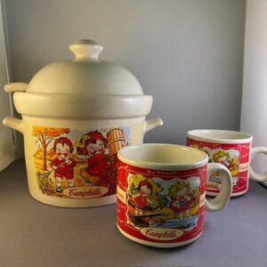 Campbell's Soup Tureen, Ladle, Lid + 2 Mugs Kids Summer and Fall Scenes Vintage