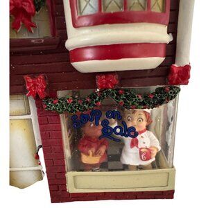 A meticulous representation of festive holiday charm, this Campbell's Corner Souper Market figurine is an authentic piece from the 2004 Campbell's Village collection by Hawthorne Village. Featuring intricate details like snow-capped roofs, vibrant red accents, and a whimsical "Soup on Sale" theme, it is both a nostalgic and decorative addition to your collection.
