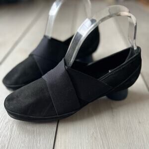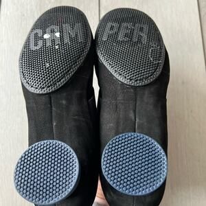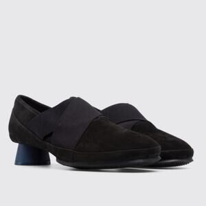 Camper women's Mary Jane. Nubuck with elastic criss-cross straps and rubber outsole.