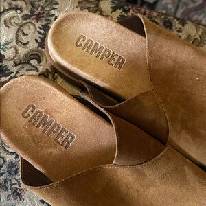 Elegant tan slides by Camper. Features a sleek criss-cross design.