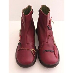 The CAMPER Burgundy Red Leather Ankle Boots are a stylish and versatile addition to any woman's wardrobe. Made with high-quality soft leather and featuring a unique applique leather flying kite design on the side of the right boot, these boots are perfect for casual occasions. With a round toe shape, flat heel, and comfortable leather lining and insole, they offer both style and comfort. The burgundy red color adds a pop of color to any outfit, while the ankle height adds a trendy touch. These boots are a must-have for fashion-forward women looking for a chic and practical footwear option. EU 39 US 8-8.5.
