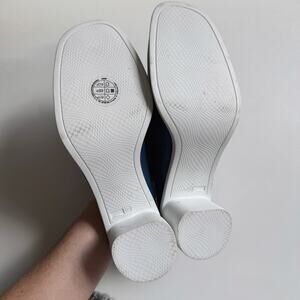 - navy blue full grain leather upper, white rubber outsole, slip on, cushioned footbed, 6cm rounded block heel