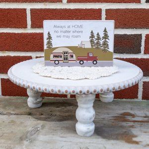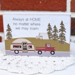 Always At Home Camper Block is made of wood and features a white washed background with a retro camper design that is being pulled by a vintage red truck. Block reads "Always at HOME no matter where we may roam" in black text and comes with two keyhole slots for hanging. Measures 4" high by 6" wide.