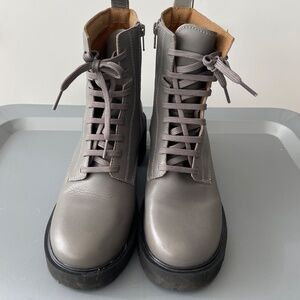 Gray leather lace-up women's boots with OrthoLite® footbeds and 100% EVA outsoles.