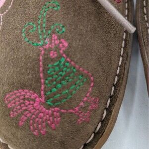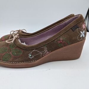 Super Cute Camper Brown Suede Embroidery Stitched Shoes! Closed Round Toe. 2.25” Rubber Comfort Wedge Heel. Designs Include Birds, Owls & Flowers in Hot Pink, Light Pink, Green, White & Light Blue Stitching All Over.