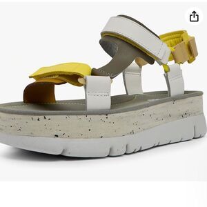 Stylish chunky platform sandals featuring white and yellow accents. Perfect for a bold look.