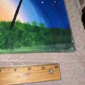 This acrylic painting on canvas measures 11 x 14 inches. Very cool piece! Unsigned. Hand painted by a local New England artist. There is some very slight discoloration around the edges, almost as though something was placed atop it while drying.