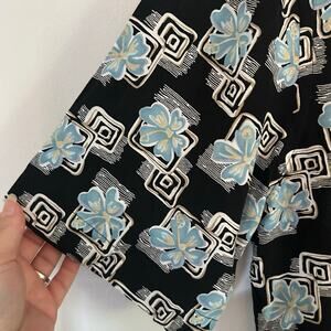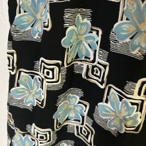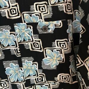 Features: Button front, 100% rayon, button chest pocket, blue flowers on black