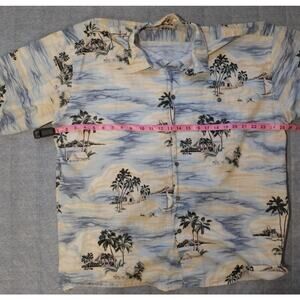 Campia Moda short sleeve camp shirt in a beachscape island print with palms, huts and sailboats. Lightweight 100% cotton, button front with coconut-shell style buttons, matched chest pocket, straight hem. Label: “Campia Moda,” 100% cotton, made in Indonesia, RN 131905; care: machine wash cold, tumble dry low, warm iron.
