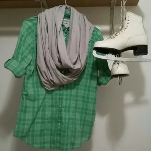 Lightweight, almost tissue cotton. Not super see through, the pattern helps. But so nice in the summer to keep the harmful, age inducing sun off your skin and still be cool. Looks great with skinny jeans and boots or leggings. Dress up or down. Can be worn long sleeved as well.