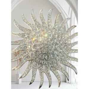 The Camrose & Kross JBK Jacqueline Kennedy Crystal Rhinestone Sun Burst Pin Brooch is a vintage designer jewelry piece signed by JBK. It features a beautiful sun burst shape with white/colorless crystal rhinestones set in rhodium plated silver metal. This brooch is a timeless and elegant accessory suitable for both men and women, adding a touch of sophistication to any outfit. Its original design and high-quality materials make it a standout piece for collectors and jewelry enthusiasts.