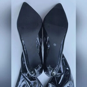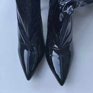 NWOT women's black patent leather stiletto boots, the heel measures approximately 4 1/2", the height from the top of the boot to the bottom of the heel measures approximately 32", the front of the boot is pointed and they are by Camssoo, the size is 43 which is approximately size 9 1/2 to 10,